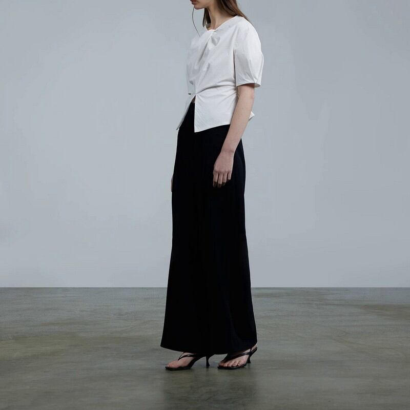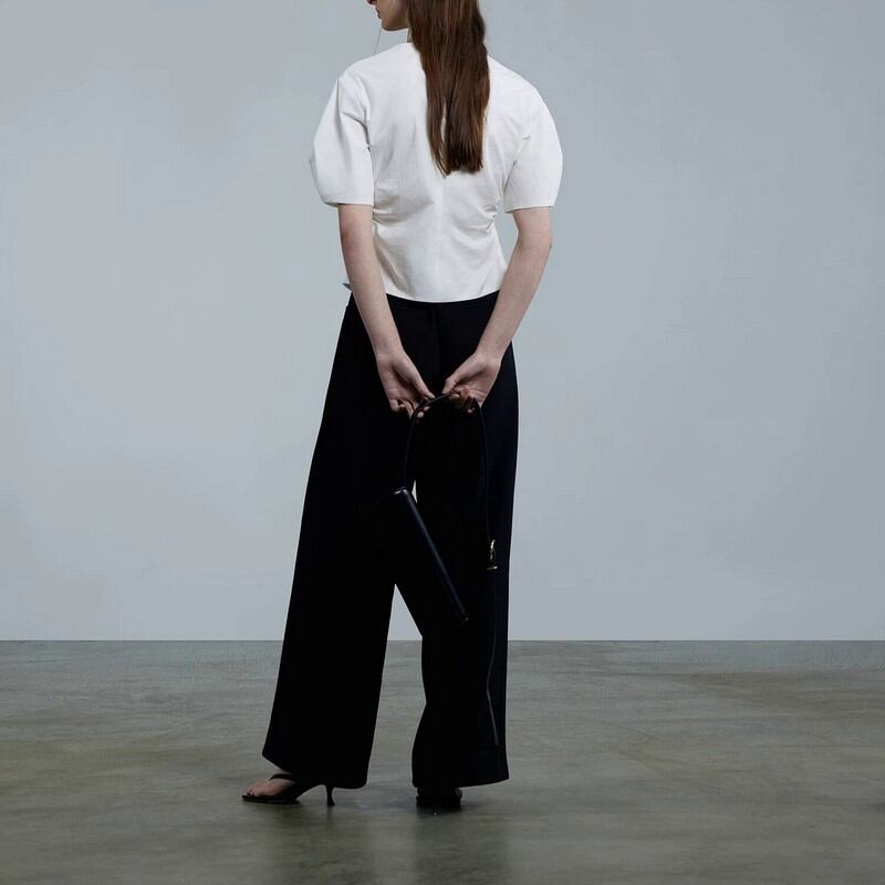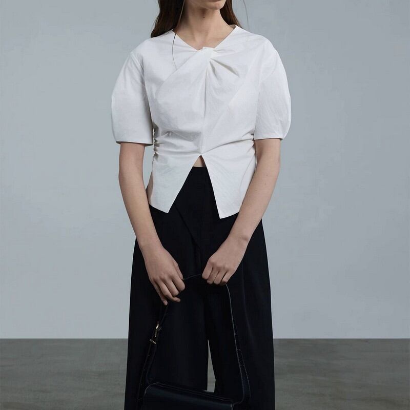 フロントノットディテールが洗練されたクロップドブラウス。フレンチスリーブが上品な印象を与え、シルエットも美しく、幅広いスタイリングに活躍します。カジュアルなボトムスと合わせれば抜け感のある着こなしに、スカートと合わせればレディライクな装いに。シーンを選ばず着回せる、ワードローブに欠かせない一着です。