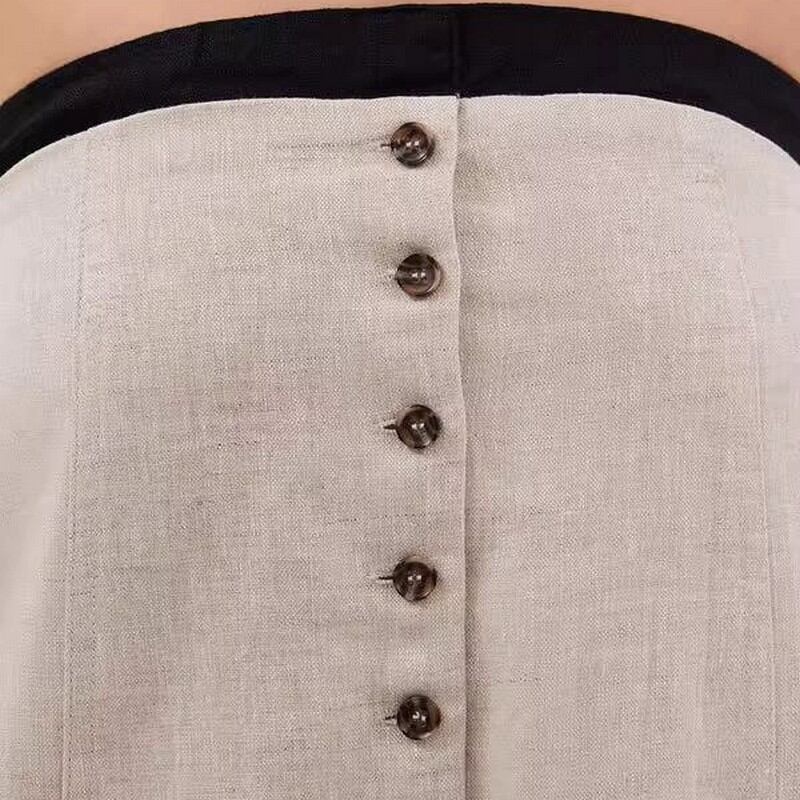 バンドカラーとフロントボタンのデザインが、シンプルながらも洗練された印象を与えます。