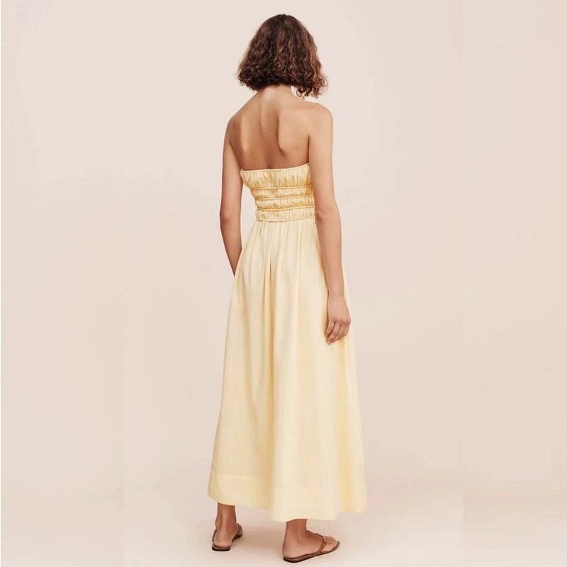 バスト下のシャーリングがウエストを細く見せ、女性らしいシルエットを演出します。