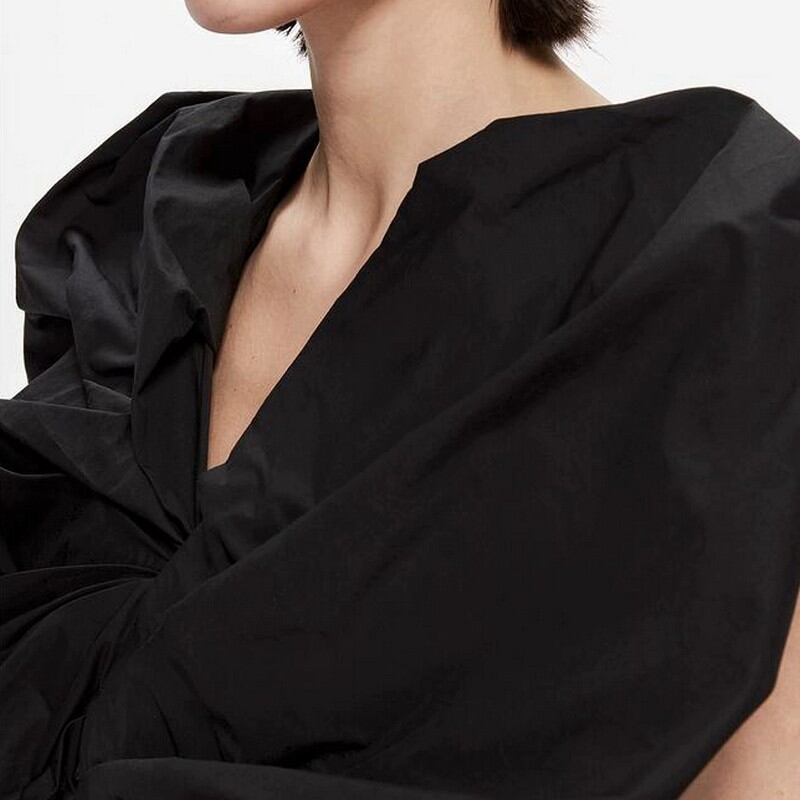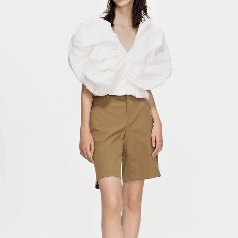Vネックのすっきりとしたデザインと、ボリュームのあるパフスリーブが絶妙なバランスのトップス。