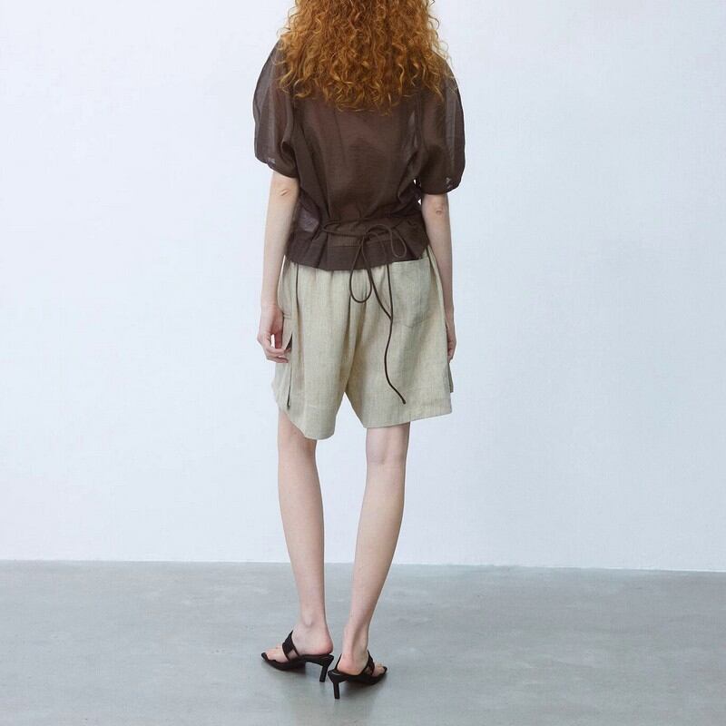 ボートネックのデザインとウエストシェイプが魅力的な半袖ブラウス。