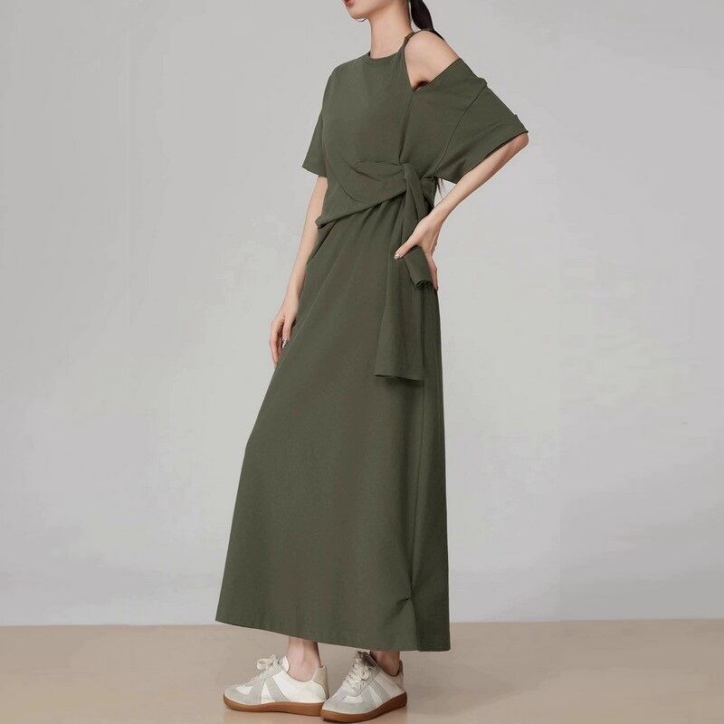 ワンショルダーのデザインが目を惹く、ロング丈のワンピースです。