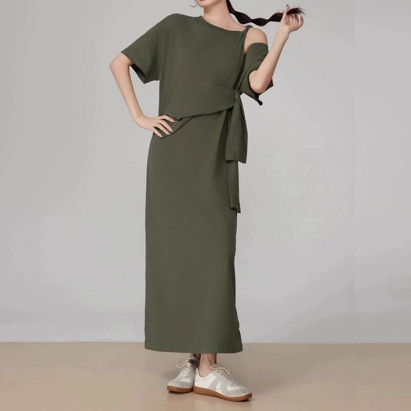 One-Shoulder Waist Ribbon Belt Maxi Sleeveless Dress W00383