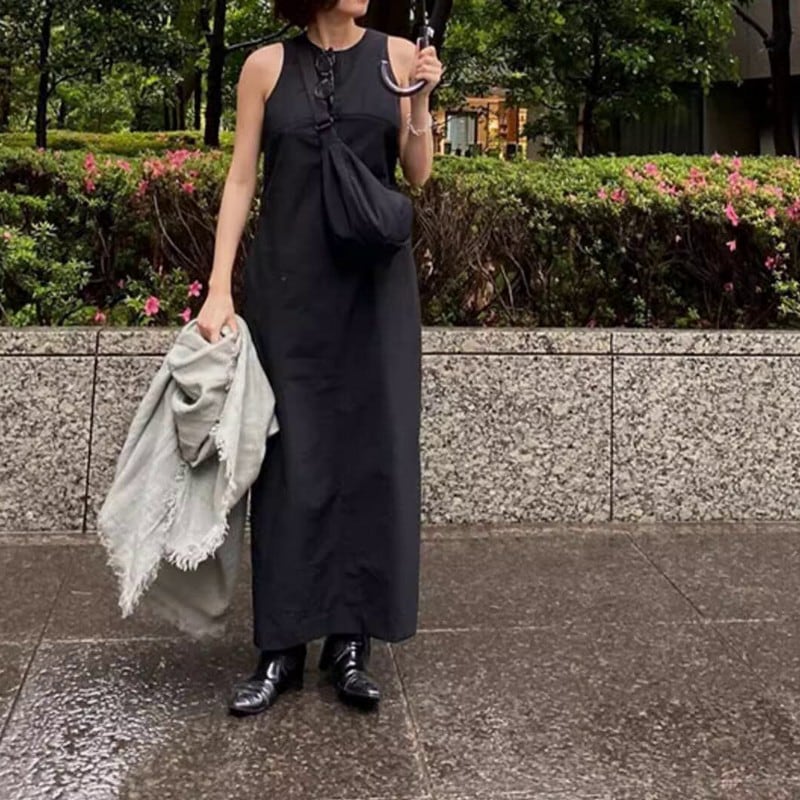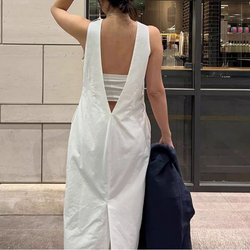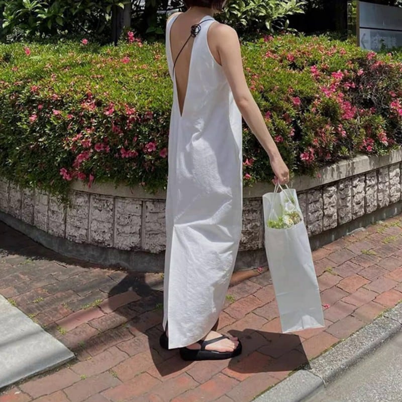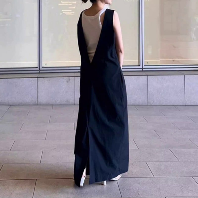 深Vネックとバックオープンデザインが魅力のロングドレス。