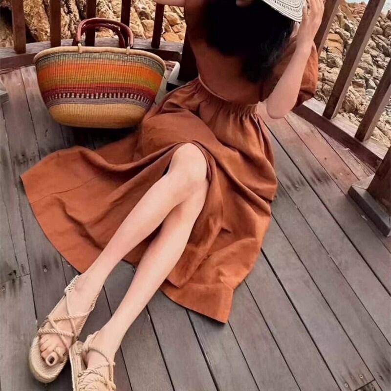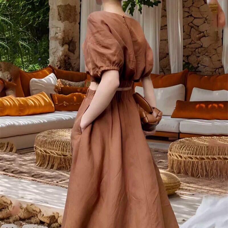 Linen Puff Sleeve Cropped Top with Maxi Skirt Set Up W00075