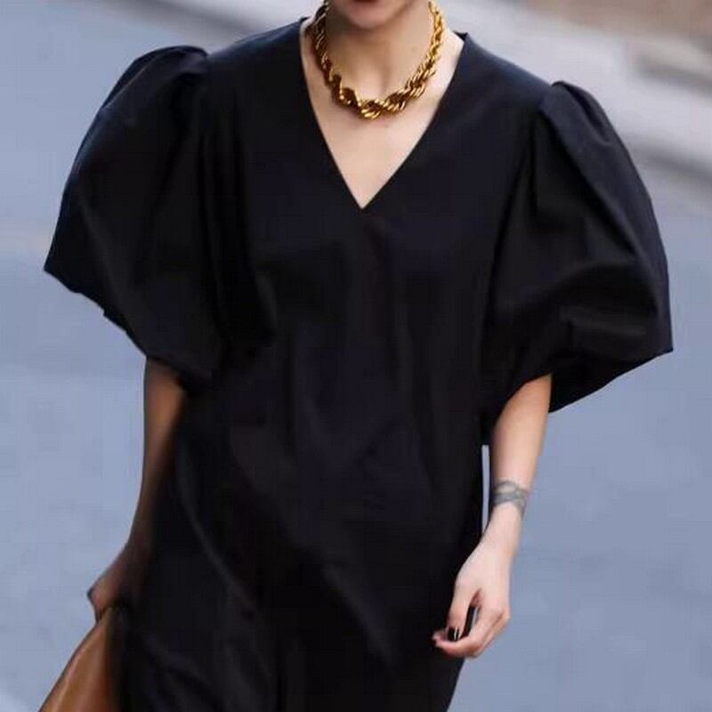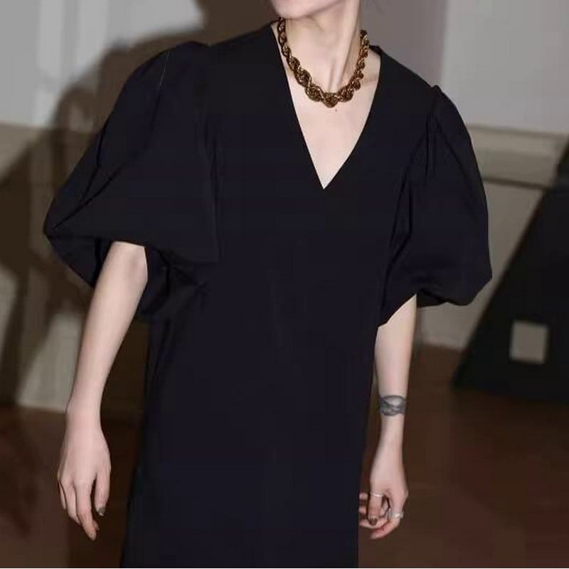 Vネックのデザインがデコルテを美しく魅せ、程よく体のラインに沿ったシルエットで洗練された印象に。