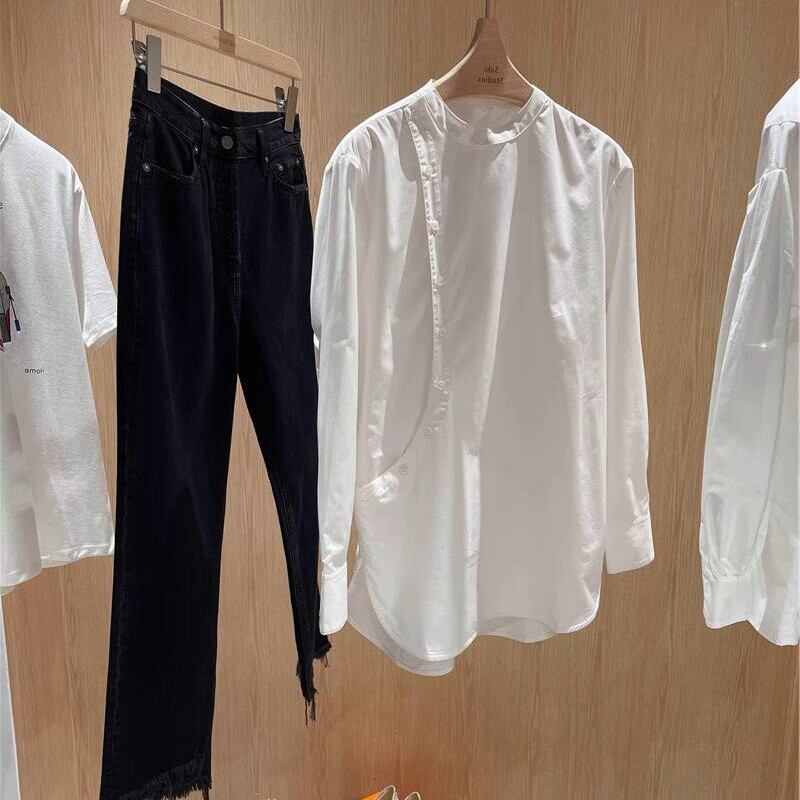 アシンメトリーな裾とカラーが洗練された印象を与えるシャツ。ダブルプラケットのデザインがさりげない個性を演出します。
